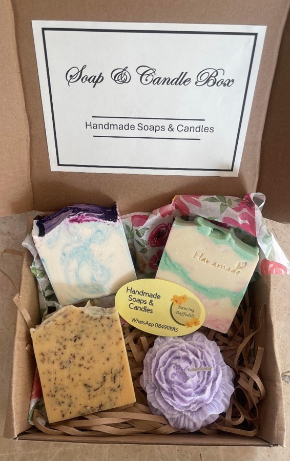 Your choice of 3 soaps and a large flower candle Presented in a lovely gift box with a personalised message